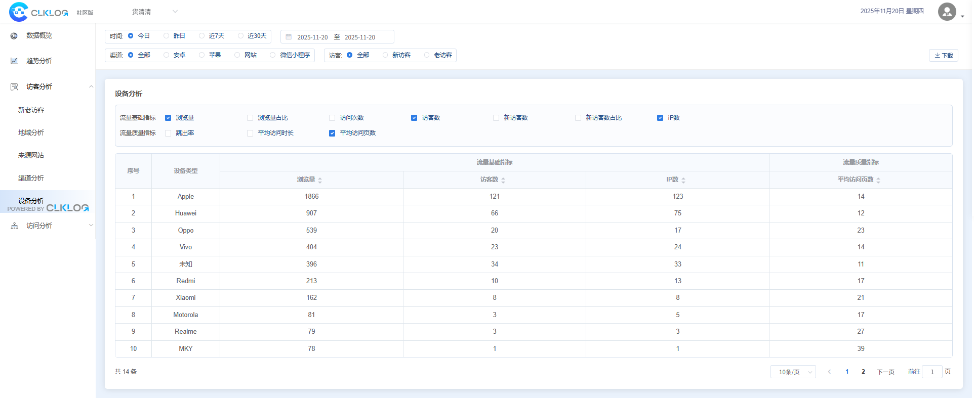 ➢ 【设备分析】从访问设备角度统计各项访问流量指标,适用于判断用户使用环境。