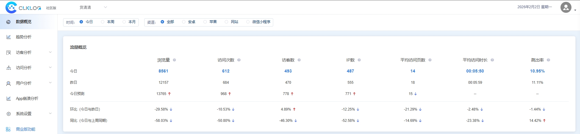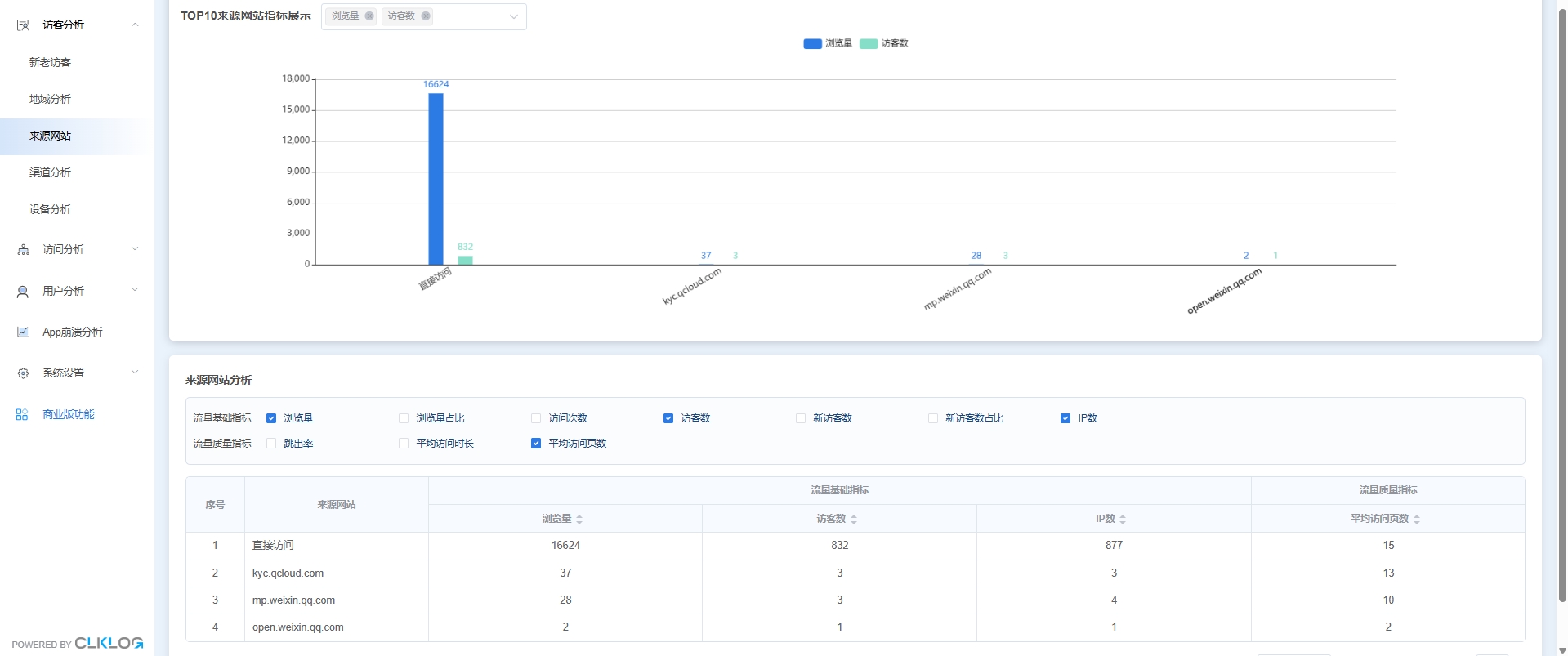 在ClkLog的设计中,我们做了一件看起来“很简单”,但在实际项目里非常关键的事情:内置了开箱即用的成熟用户行为分析模型(如基础访问、访问来源等)。